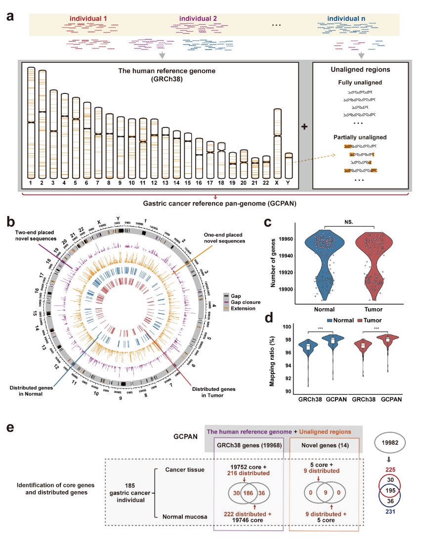 近日,36365线路检测登录入口韦朝春教授课题组、36365线路检测登录入口医学院附属瑞金医院于颖彦教授课题组、朱正纲教授课题组上海中医药大学交叉科学研究院陈红专教授课题组和复旦大学附属肿瘤医院章真教授课题组等多家单位联合完成了汉族人胃肿瘤泛基因组研究,相关成果论文“Pangenomic analysis of Chinese gastric cancer”于2022年9月15日在线发表在国际著名学术期刊《Nature Communications》。该研究将全新的泛基因组研究方法引入人类肿瘤基因组研究。通过构建胃癌人群泛基因组,再以泛基因组作为参照分析胃癌全基因组测序数据,发现胃癌个体基因组中的一些存在-缺失变异(Presence-absence variation,PAV)和胃癌表型存在显著关联。该研究成果为解析中国人胃癌高发的分子遗传学背景提供了重要参考。