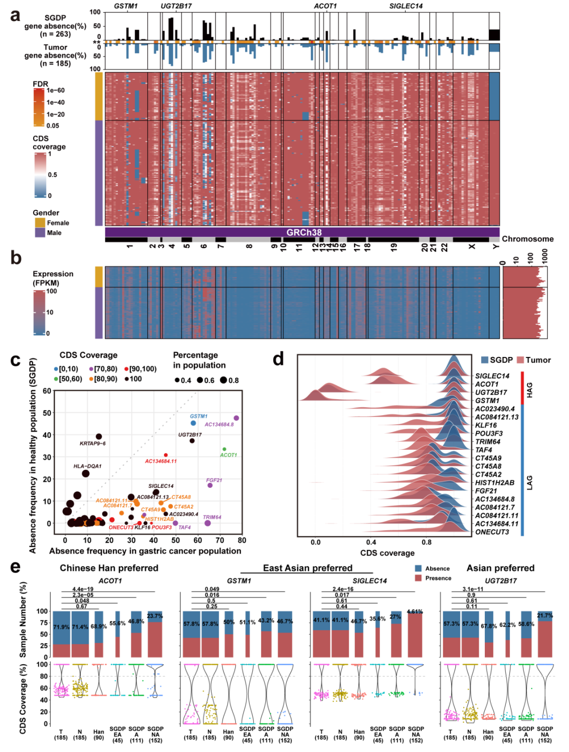 该研究使用HUPAN分析了185对胃癌及癌旁组织(共370个样本)的全基因组深度测序数据,构建了包含人类参考基因组(GRCh38)和80.88 Mbp新序列的胃癌泛基因组。其中,新序列包含至少14个新基因。再将个体基因组以泛基因组为参照进行比对,识别胃癌患病个体基因组中的PAV。在胃癌人群中总计发现261个非必需基因(在一个或多个个体中缺失或部分缺失的基因),其中195个非必需基因属于癌旁和癌组织共有的基因(186个位于人类参考基因组上,9个新序列基因)。再将这些非必需基因与公共数据库中不同种族健康人群的基因组测序数据集对比发现,有些非必需基因的存在或缺失可以增加胃癌易感性。例如,非必需基因ACOT1、GSTM1、SIGLEC14和UGT2B17在胃癌人群中缺失率显著高于其他人群。