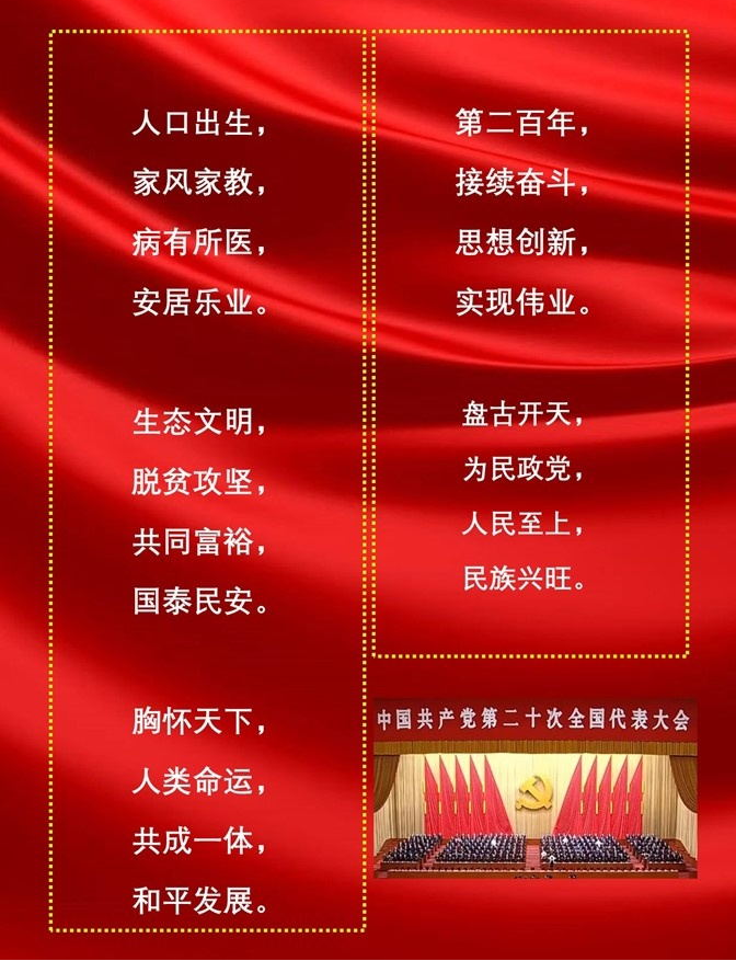 中国共产党第二十次全国代表大会的胜利召开,让人欢欣鼓舞。我认真聆听了习总书记所作的大会报告,令人振奋,感想有三:一是,中国共产党人始终不忘初心,牢记使命的坚守和担当,带领全国各族人民努力奋斗,创造了非凡成就。习总书记在报告中说,过去的十年我们经历了三件大事,其中之一完成脱贫攻坚,全面建成小康社会的历史任务,实现第一个百年奋斗目标。全国有832个贫困县全部摘帽,近一亿人农村贫困人口实现脱贫,历史性的解决了绝对贫困问题,为全球减贫事业作出了重大贡献。数字的背后,更彰显希望和力量,使我们坚信,只有中国共产党的领导,只有社会主义制度才能将不可能的事情变成可能。二是,习总书记在报告中谈到了未来五年及更长远的党和国家事业发展的目标任务以及新思路,新战略,新举措。蓝图宏伟,任重道远。相信在以习近平同志为核心的党中央领导下,一定会让中国人民过上更美好的幸福生活。身为共产党员,为党感到自豪,为党的新征程加油。其三,报告中谈到实施科教兴国战略时,要坚持为党育人,为国育才。曾在大学工作的我们这些老党员,有责任为党做些力所能及的工作。退休后这十年来,我一直受聘于学校组织部特邀党建组织员一职,为青年大学生教育和党员发展工作,尽力而为。我会继续努力,做合格党员,为党增光。
