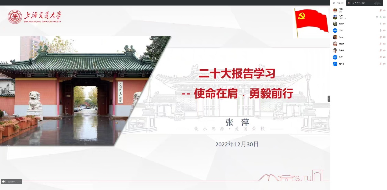 2022年12月30日下午,实验教学中心-仪器平台党支部通过腾讯会议举行本月主题党日活动。党支部书记张萍讲授“使命在肩、勇毅前行——党的二十大报告专题学习”专题党课,支部全体党员集中观看辅导视频《二十大党章解读——新征程上党旗飘扬》。