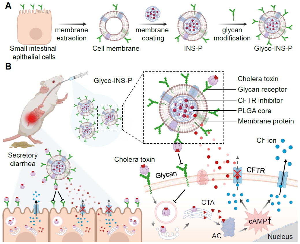 受到霍乱毒素入侵宿主细胞过程的启发,我们设计了一种糖萼受体功能化的小肠上皮细胞膜仿生纳米诱饵(Glyco-INS),用于口服治疗霍乱毒素引起的分泌性腹泻。首先,我们提取小肠上皮细胞的细胞膜,将其包覆在可生物降解的聚乳酸-羟基乙酸(PLGA)纳米核心上,并在细胞膜表面嵌入糖脂分子(富含唾液酸的神经节苷脂)来构建Glyco-INS,其尺寸约为160 nm,且完整保留了小肠上皮细胞的所有膜蛋白成分。在霍乱毒素入侵宿主细胞实验中,Glyco-INS能够有效捕获霍乱毒素(94%),从而抑制小肠上皮细胞内cAMP浓度的升高。同时,我们将一种强效CFTR抑制剂(PPQ-102, IC50 ~90 nM)装载到Glyco-INS的PLGA核心中(Glyco-INS-P),通过胃肠道微环境响应的精准药物控释,有效阻断霍乱毒素感染的宿主细胞内Cl-离子的过度外排,实现了“内外兼顾”的协同治疗。在霍乱毒素引起的小鼠腹泻模型中,口服Glyco-INS-P能够有效减少小鼠的腹泻肠液体积、炎症因子表达和和肠道组织损伤,并恢复到健康小鼠的水平。更重要的是,Glyco-INS天然继承了宿主细胞膜上全部的靶蛋白和糖萼受体,有望广谱性中和多种具有复杂结构和致病机制的细菌外毒素,从而为治疗不同致病菌引起的腹泻相关疾病提供了广谱应对方案,具有潜在的临床应用前景。