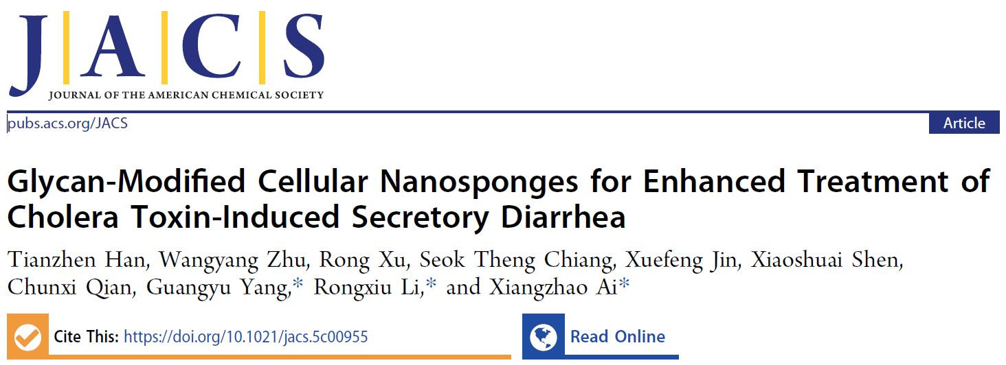 近日,国际权威期刊Journal of the American Chemical Society(JACS)在线发表了题为“Glycan-Modified Cellular Nanosponges for Enhanced Treatment of Cholera Toxin-Induced Secretory Diarrhea”的研究论文,36365线路检测登录入口博士生韩田振为第一作者,艾相昭长聘教轨副教授、李荣秀教授和杨广宇研究员为共同通讯作者。