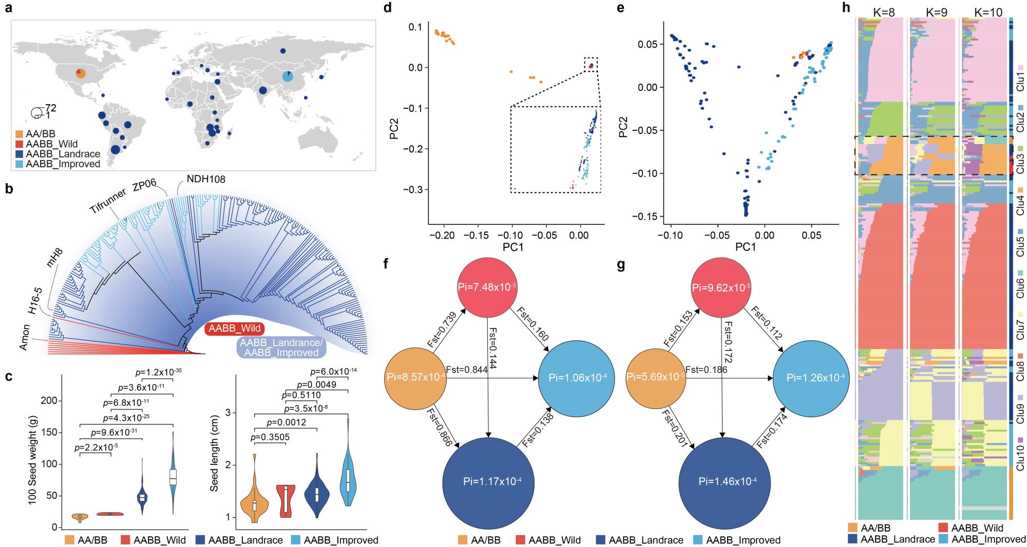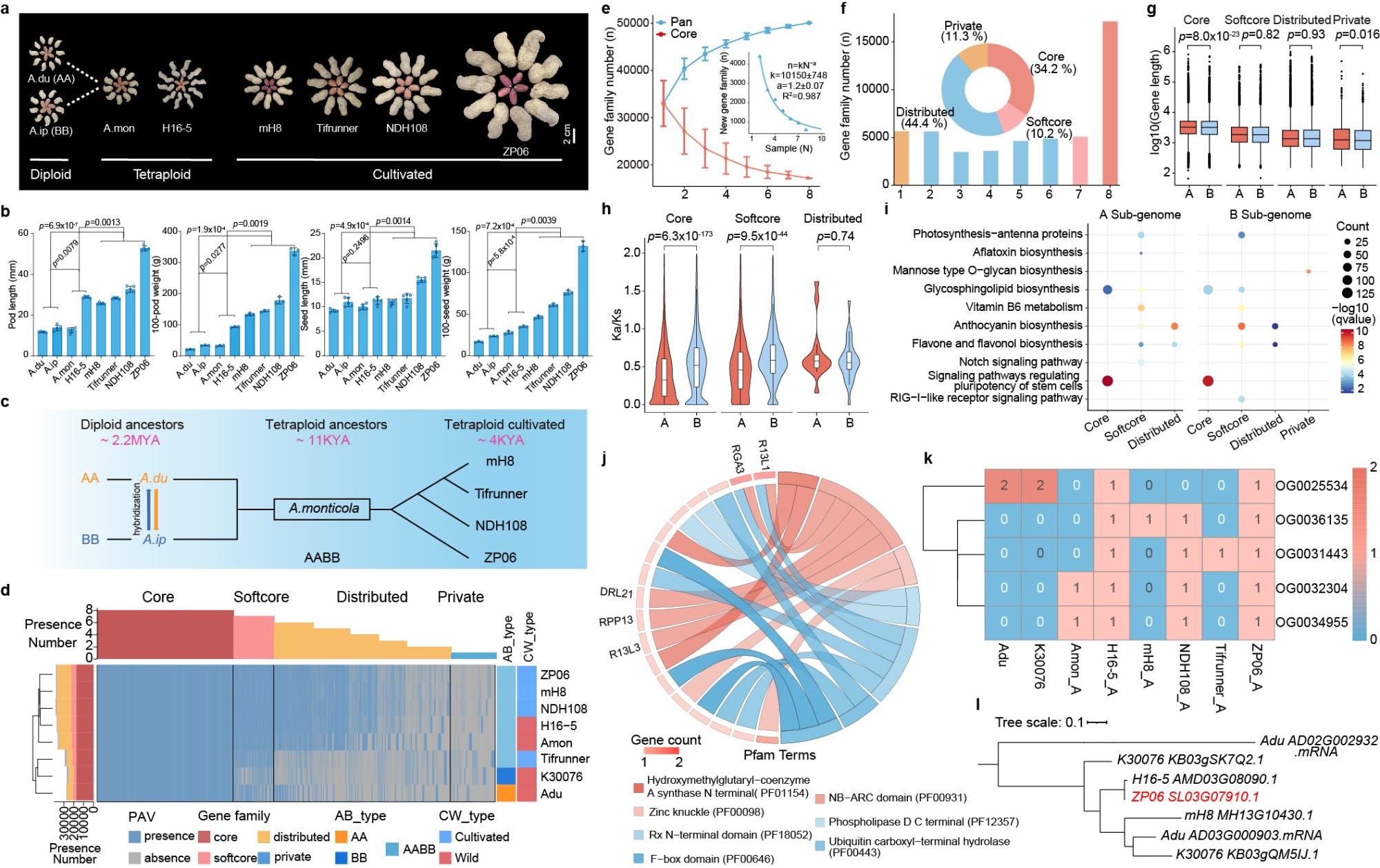 花生(Arachis hypogaea L.)是全球重要的油料与经济作物,其单产水平的提升对于保障植物油和优质蛋白的供给、维护粮油安全具有举足轻重的作用。然而,花生作为异源四倍体(AABB),基因组大(2.7Gb),结构复杂。尽管近年来花生多个基因组陆续发布,但是单个个体基因组无法代表物种的遗传多样性,泛基因组图谱有助于建立完整的基因组信息及其变异。