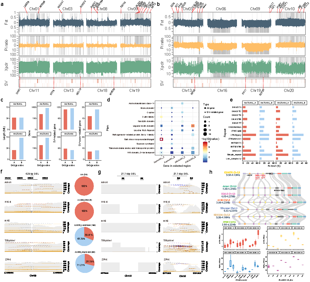 基于泛基因组的SV识别及随后的SV-GWAS鉴定到全基因组鉴定出1,335个与驯化相关的SV,其中329个发生在基因编码区域。值得注意的是,19个基因与果实大小、抗病等性状相关。其中,CRK26基因存在629bp缺失,NTF6基因与FBRL2基因组成的串联单元在不同花生品种中存在拷贝数变异。此外,研究还鉴定出117个与种子重量相关的结构变异,并通过SV-GWAS分析在Chr03染色体上鉴定到一个与花生籽粒重量显著关联的结构变异(图3)。