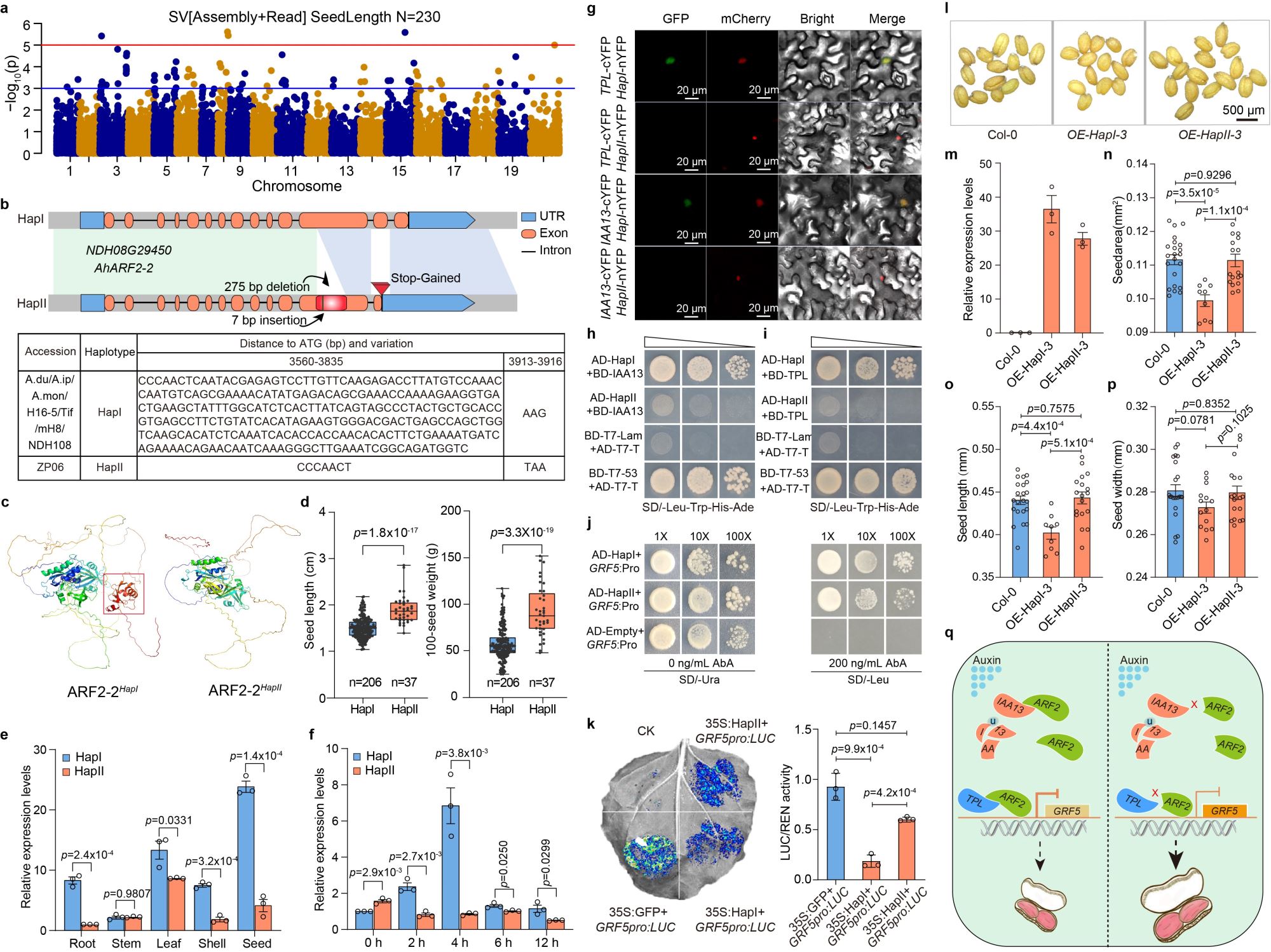 Chr08染色体52 Mb区域存在与籽粒大小显著关联的SV,发现AhARF2-2基因第12个外显子存在275 bp缺失和7 bp插入,导致AUX/IAA结构域丢失。突变型AhARF2-2HapII丧失与AhIAA13/TPL的互作能力,降低了对AhGRF5的抑制作用,进而促进了籽粒膨大。转基因拟南芥表明,HapII株系种子显著增大。分子标记开发及表达分析证实该变异在栽培种中的选择优势,进而提出AhARF2-2调控花生籽粒大小的分子模型,为花生高产育种提供关键靶标(图4)。