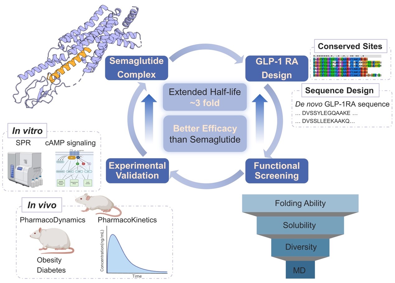 多肽药物在现代医学中具有重要意义,为多种疾病的治疗提供了全新的策略。然而,传统多肽药物设计面临成功率低、研发周期长、成本高等瓶颈。本研究将基于人工智能的蛋白质设计与功能筛选相结合,实现了高效设计半衰期更长药效更优的多肽药物。