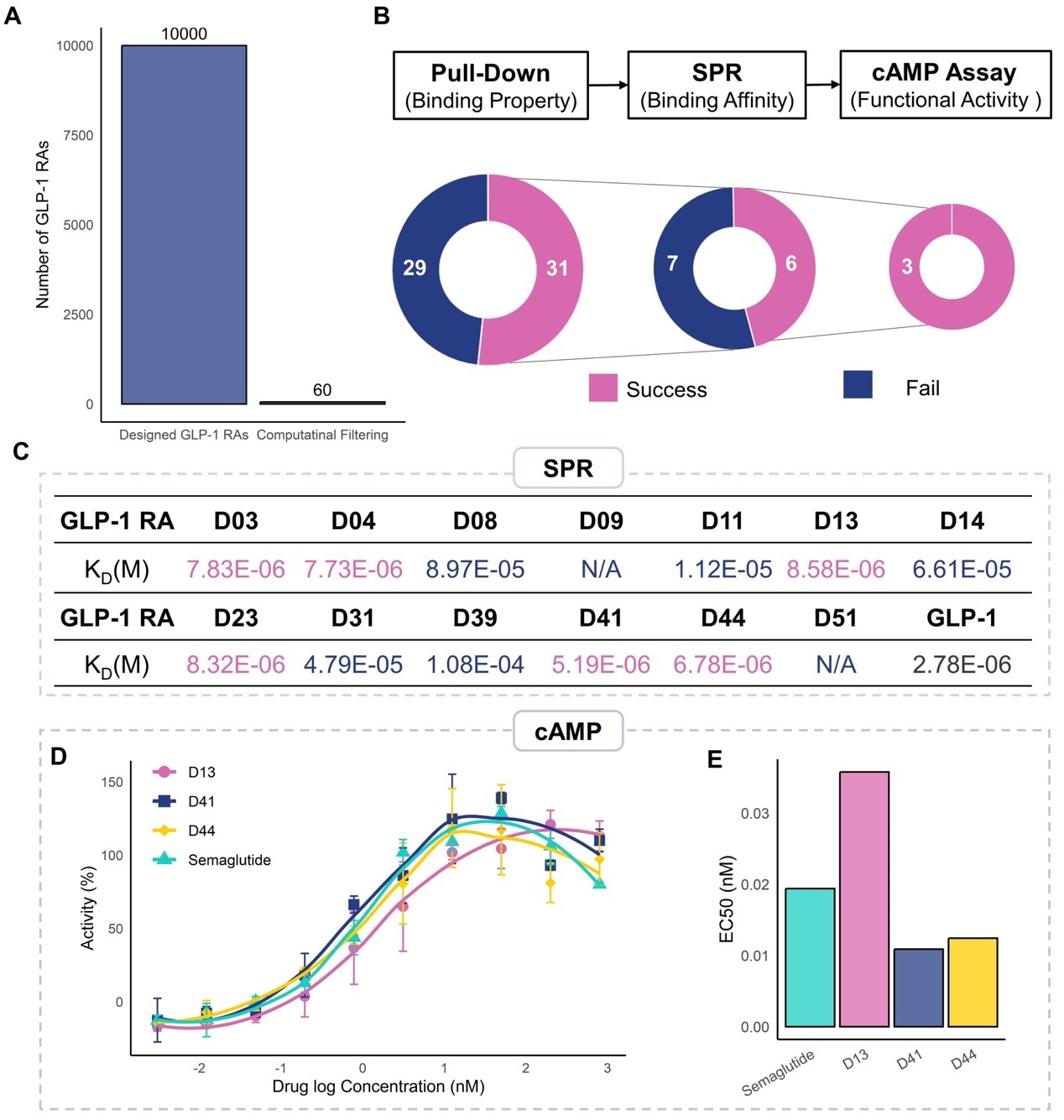本研究共设计了10,000个全新的GLP-1RAs序列,依据稳定性、有效性及多样性等筛选标准筛选出60种用于体外试验(包括Pull-Down、SPR、cAMP信号检测)。Pull-Down试验揭示了31个设计的GLP-1RAs能够与GLP-1R结合;SPR试验进一步定量评估其结合亲和力,结果发现有6个GLP-1RAs的结合亲和力与Semaglutide相当。细胞实验揭示三种GLP-1RAs (D13、D41和D44)能够有效激活cAMP信号通路(如图2所示)。
