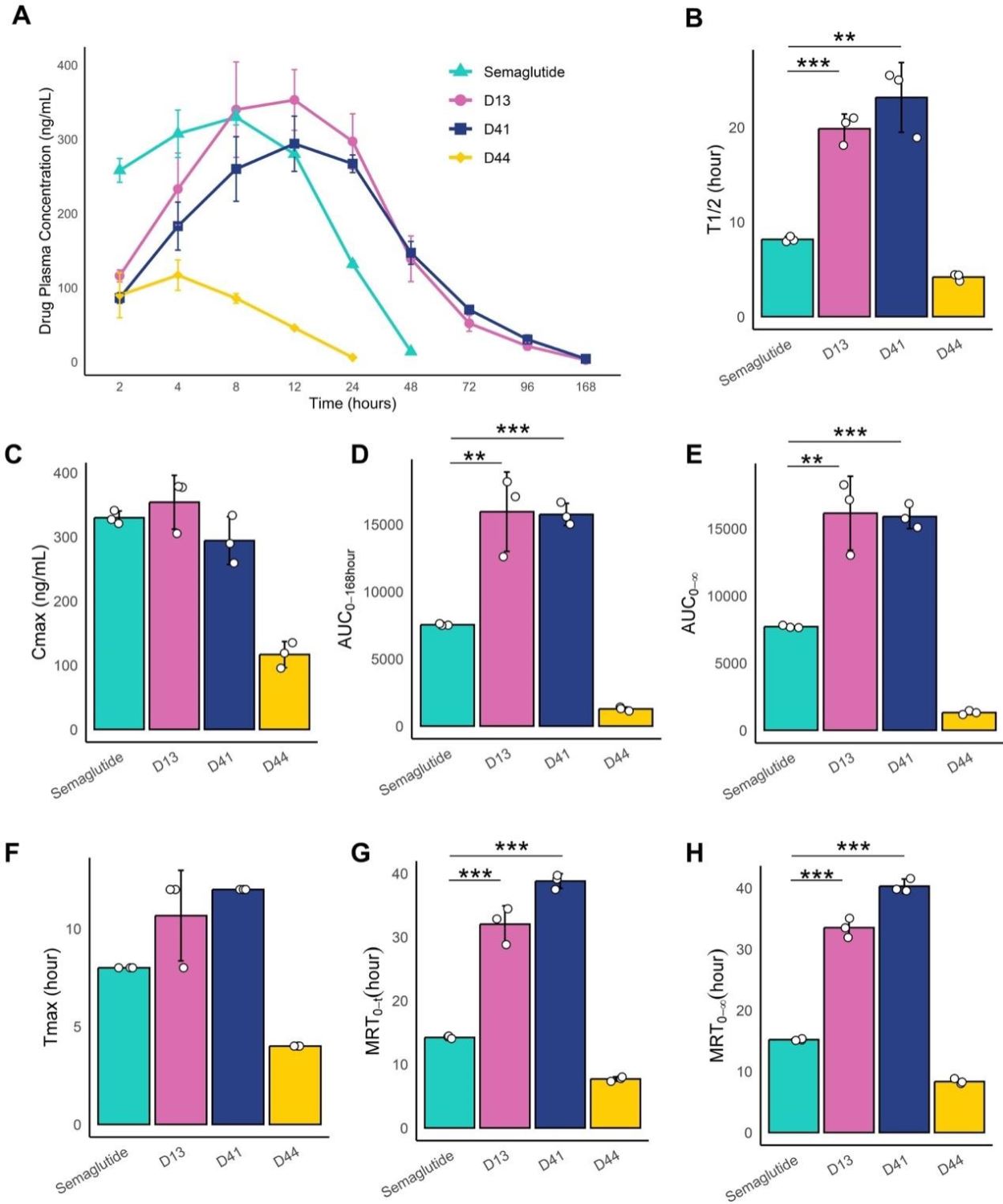 药代动力学(Pharmacokinetics, PK)试验结果表明,两种GLP-1RA候选多肽(D13和D41)在SD大鼠均表现出更长的半衰期(T1/2),约为Semaglutide的3倍。具体来说,D13的半衰期为19.86小时,是Semaglutide(8.17小时)的2.43倍;D41的半衰期为23.16小时,是Semaglutide的2.83倍(如图3所示)。