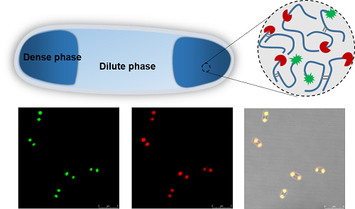 Our lab has long been focusing on the design and biosynthesis of protein polymers and biomaterials1, and my first project was actually the production of recombinant spider silk proteins in the bacterial cell factory Escherichia coli, following the endeavors of my advisors and lab seniors2,3. At first, I came up with an idea to label the spider silk protein with a green fluorescent protein, aiming to “see” the silk production levels in the bacterial cells by measuring fluorescence. Unfortunately, this did not always work reliably. The lucky thing was that my supervisor advised me to investigate the intracellular distribution of the spider silk proteins via fluorescence microscopy. Interestingly, the recombinant spider silk proteins spatially localized near the pole regions of E. coli cells (see Figure 1 below), which shocked me, simply because the silk proteins were expressed in a soluble form instead of insoluble inclusion bodies that are commonly seen in prokaryotic expression systems. Then, why and how the silk proteins condense in the living cells? It was later made clear that our spider silk proteins, natively unfolded and disordered with low-complexity sequences, share common features with the eukaryotic LLPS proteins that are naturally involved in membraneless organelle formation. Then we verified that LLPS underlay the formation of silk condensates within E. coli cells, and demonstrated functionalization of the synthetic membraneless compartments with biocatalytic activities4.Furthermore, we found that other disordered structural proteins (e.g. resilin) formed similar compartments inside the E. coli cells, indicating applicability of our compartmentalization strategy with heterologous structural proteins. In addition, the bacterial cell physiology was not substantially altered with the emergence of subcellular liquid condensates, indicating their good potential for biotechnological applications.