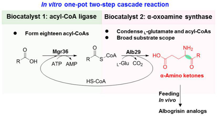 The cover graphic illustrates a one-pot two-step enzymatic reaction to synthesize different α-amino ketones. An α-oxoamine synthase (Alb29) involved in albogrisin biosynthesis in Streptomyces albogriseolus MGR072 was characterized and used for the incorporation of L-glutamate to acyl-coenzyme A substrate. Meanwhile, an acyl-coenzyme A ligase (Mgr36), which is mined from the genome of the same strain, was exploited to provide the corresponding acyl-CoA using carboxylic acid and HS-CoA. In this system, HS-CoA was internally recycled.